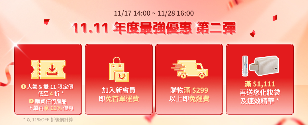 至2025-11-28T08:00:00.000+00:00截止 全店,雙11第二輪優惠💟購買任何產品即享11% OFF🎊